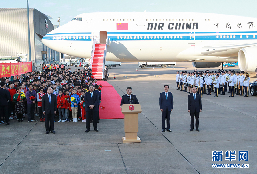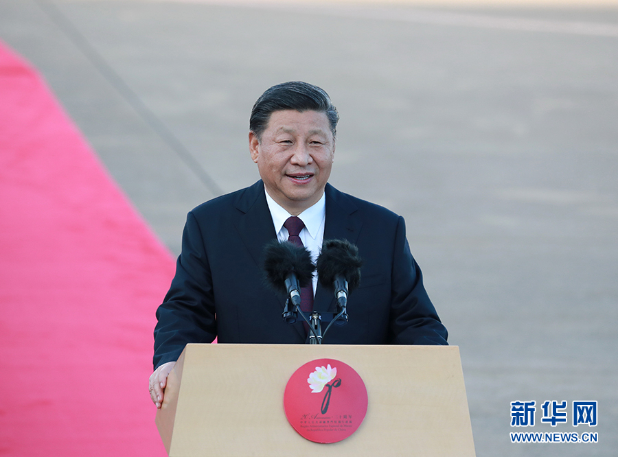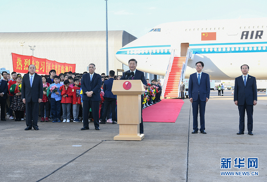 12月18日,中共中央總書記、國(guó)家主席、中央軍委主席習(xí)近平乘專機(jī)抵達(dá)澳門,出席將于20日舉行的慶祝澳門回歸祖國(guó)20周年大會(huì)暨澳門特別行政區(qū)第五屆政府就職典禮并視察澳門。這是習(xí)近平在機(jī)場(chǎng)發(fā)表重要講話。 新華社記者 謝環(huán)馳 攝