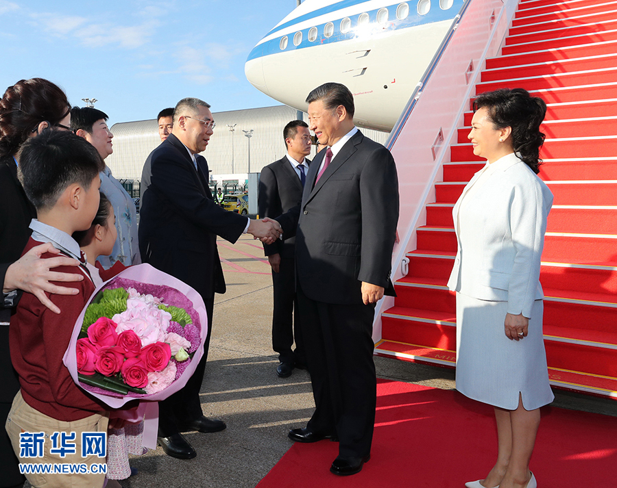 12月18日,中共中央總書記、國(guó)家主席、中央軍委主席習(xí)近平乘專機(jī)抵達(dá)澳門,出席將于20日舉行的慶祝澳門回歸祖國(guó)20周年大會(huì)暨澳門特別行政區(qū)第五屆政府就職典禮并視察澳門。這是習(xí)近平和夫人彭麗媛走出艙門,向歡迎人群揮手致意。 新華社記者 謝環(huán)馳 攝