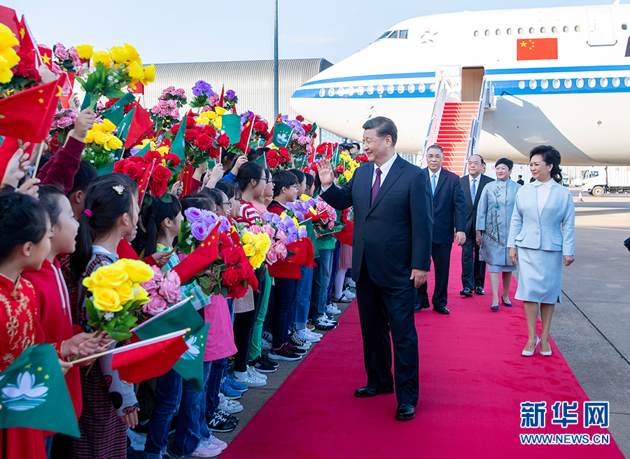 16時(shí)許,習(xí)近平乘坐的專機(jī)徐徐降落在澳門國(guó)際機(jī)場(chǎng)。習(xí)近平和夫人彭麗媛走出艙門,向歡迎人群揮手致意。澳門警察樂隊(duì)奏響熱情喜慶的歡迎曲,現(xiàn)場(chǎng)一片歡騰。舷梯旁,兩名澳門少年兒童向習(xí)近平和彭麗媛獻(xiàn)上鮮花。在澳門特別行政區(qū)行政長(zhǎng)官崔世安和夫人霍慧芬陪同下,習(xí)近平和彭麗媛同前來迎接的人員親切握手。數(shù)百名澳門青少年和各界群眾代表?yè)]動(dòng)國(guó)旗、特別行政區(qū)區(qū)旗和鮮花,熱烈歡迎習(xí)近平的到來。