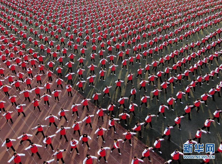 河南省焦作市溫縣第一高級中學(xué)的學(xué)生在操場上練拳(無人機(jī)照片,12月15日攝)。新華社記者 李安 攝