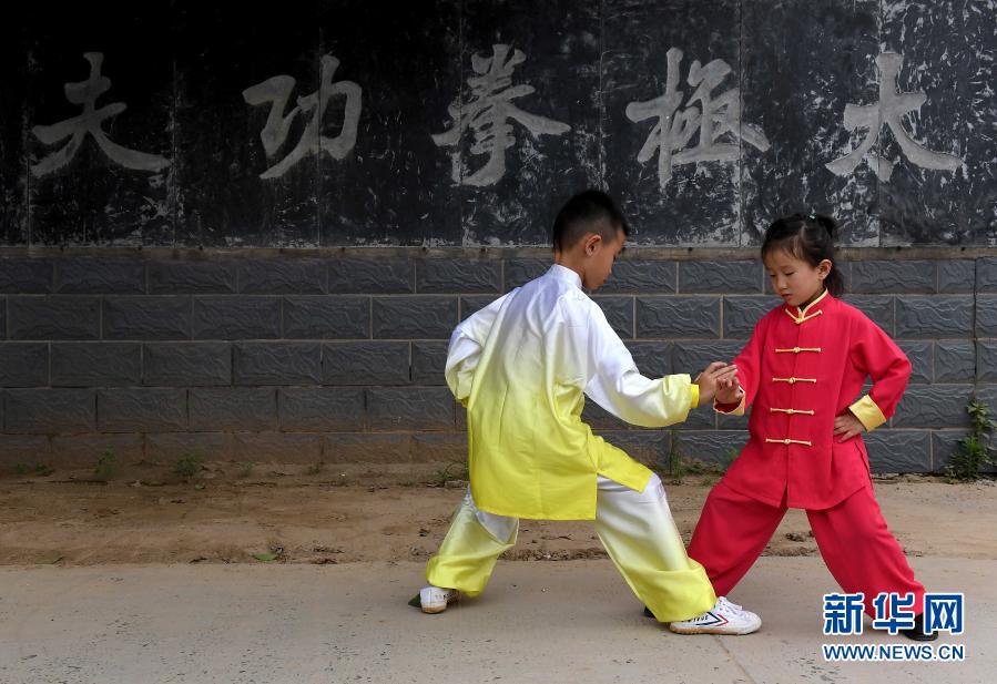 兩名小朋友在河南省焦作市溫縣陳家溝一處拳館外習(xí)練太極拳(2018年6月29日攝)。新華社記者 李安 攝