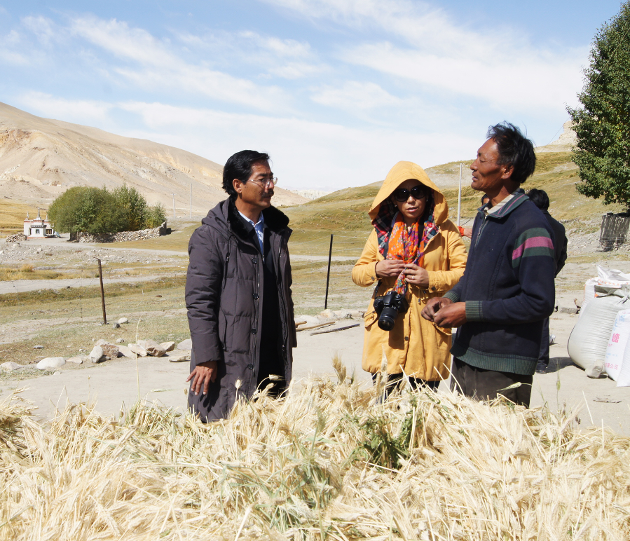 這是尼瑪扎西(左一)在了解青稞種植情況。(資料照片)新華社發(fā)
