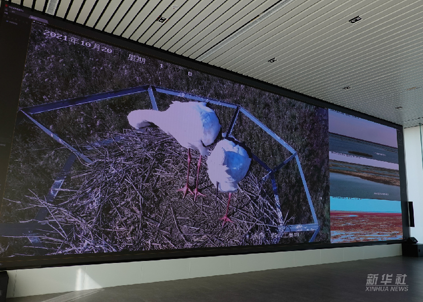 黃河三角洲生態(tài)監(jiān)測中心智慧大屏上顯示的保護區(qū)監(jiān)控畫面和相關(guān)數(shù)據(jù)(2021年10月20日攝)。