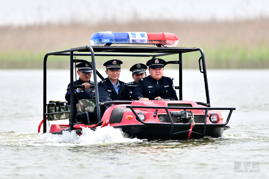 在山東黃河三角洲國家級自然保護區(qū),民警楊華章(前排左)乘坐水陸兩棲巡邏車和同事們巡查(2021年5月1日攝)。