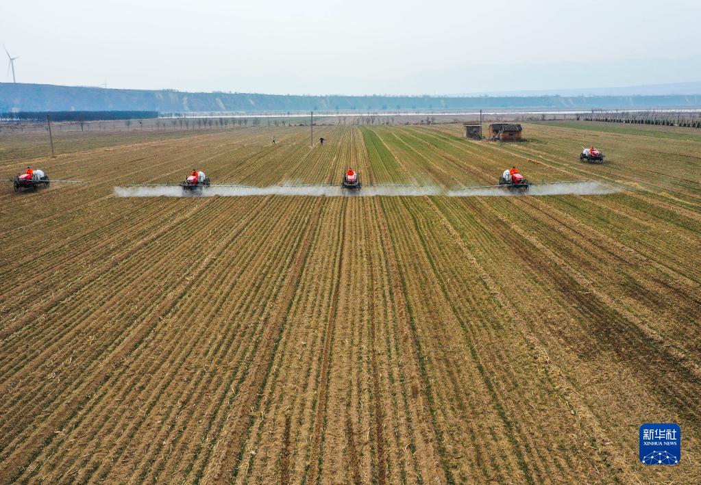 2月22日,高地隙植保機在山西省運城市芮城縣新村作業(yè)(無人機照片)。新華社記者 柴婷 攝