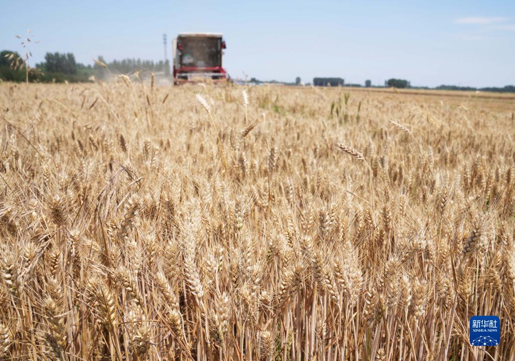 聯(lián)合收割機在河北省唐山市灤南縣長凝鎮(zhèn)方泡村田間收割小麥(2021年6月22日攝)。新華社記者 楊世堯 攝