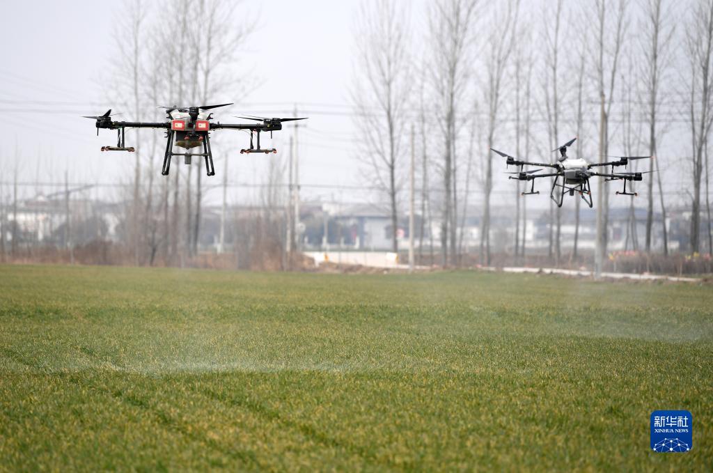 2月11日,無人機在安徽省亳州市譙城區(qū)趙橋鄉(xiāng)“無人農(nóng)場”噴灑除草劑。新華社記者 劉軍喜 攝