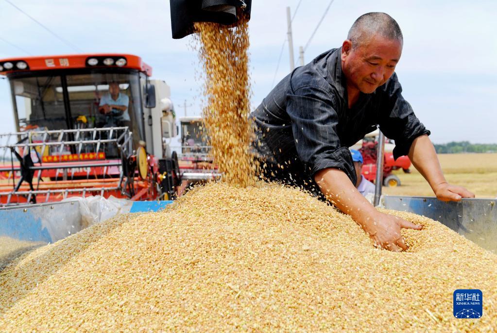 河北省衡水市阜城縣崔家廟鎮(zhèn)前磚門村農(nóng)民在麥田收獲小麥(2021年6月13日攝)。新華社記者 朱旭東 攝