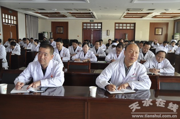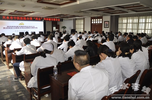 為進一步提高黨員干部理論學(xué)習(xí)水平,深入理解習(xí)近平新時代中國特色社會主義思想、把握新時代中國特色社會主義發(fā)展的戰(zhàn)略安排,4月19日下午,天水市中醫(yī)院召開輔導(dǎo)報告會,邀請到中共天水市委黨校侯強強深入傳達了全國“兩會”精神。會議由市中醫(yī)院黨委書記李曉峰主持,全體黨員、預(yù)備黨員和入黨積極分子共120余人參加會議。