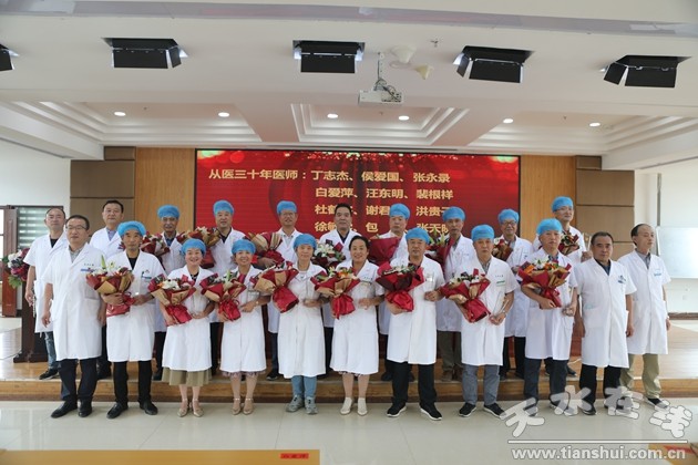 李剛表示,醫(yī)院有這樣一群人,他們是學(xué)科帶頭人,他們從醫(yī)三十載,把青春無(wú)私奉獻(xiàn)給自己熱愛(ài)的醫(yī)療事業(yè);他們身體力行、殫精竭慮,診治過(guò)成千上萬(wàn)的病人;他們秉承醫(yī)院“仁愛(ài)、奉獻(xiàn)、爭(zhēng)先、超越”的院訓(xùn),用精湛的醫(yī)術(shù)與無(wú)私的奉獻(xiàn)精神,為患者的健康、醫(yī)院的發(fā)展做出長(zhǎng)期的突出貢獻(xiàn)。他們是年輕醫(yī)師的風(fēng)向標(biāo),是我們學(xué)習(xí)的楷模。丁志杰、李剛為從醫(yī)三十年的16位醫(yī)師頒發(fā)了留念杯,贈(zèng)送了鮮花,并合影留念。