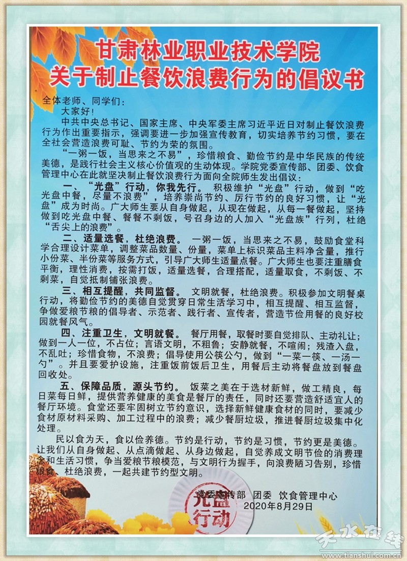 甘肅林業(yè)職業(yè)技術(shù)學(xué)院黨委高度重視、周密部署,全院師生迅速行動(dòng),以多種形式深入學(xué)習(xí)宣傳貫徹落實(shí),以實(shí)際行動(dòng)踐行習(xí)近平總書(shū)記重要指示精神,弘揚(yáng)中華民族勤儉節(jié)約的傳統(tǒng)美德。