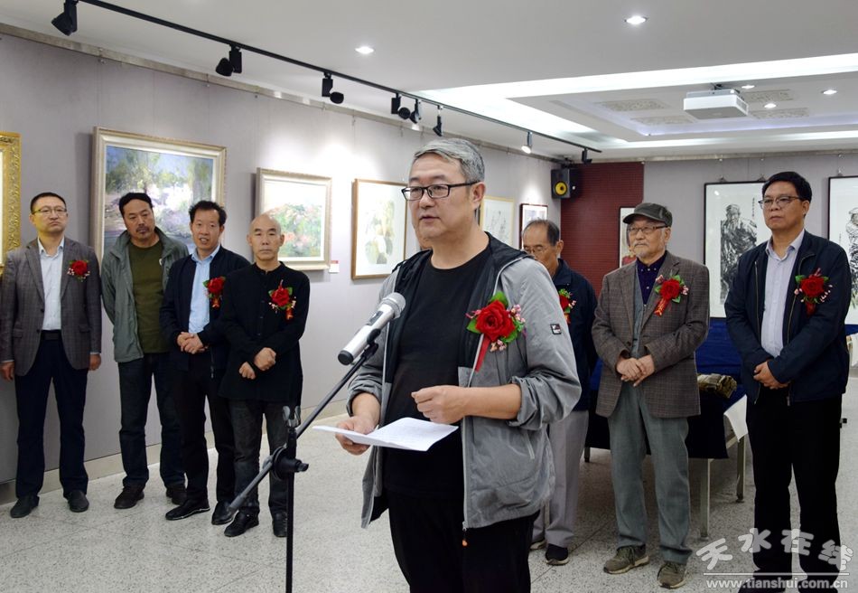 開(kāi)展儀式上,甘肅省美術(shù)家協(xié)會(huì)副主席、天水市美術(shù)家協(xié)會(huì)主席、天水師院藝術(shù)館館長(zhǎng)賈利珠教授向來(lái)賓介紹了展覽籌備情況;天水市文聯(lián)黨組成員、副主席文軍講話,預(yù)祝展覽圓滿成功。