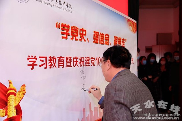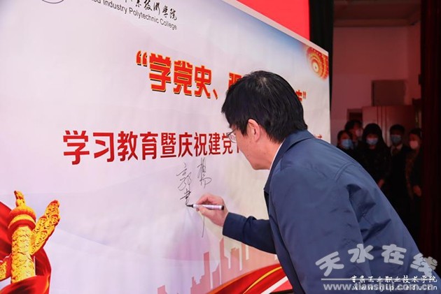 會(huì)上,楊聲宣布甘肅工業(yè)職業(yè)技術(shù)學(xué)院“學(xué)黨史、強(qiáng)信念、跟黨走”學(xué)習(xí)教育暨慶祝建黨百年系列活動(dòng)正式啟動(dòng)!隨后,與會(huì)領(lǐng)導(dǎo)及師生代表在“學(xué)黨史、強(qiáng)信念、跟黨走”學(xué)習(xí)教育暨慶祝建黨百年系列活動(dòng)簽名墻上簽名留念。