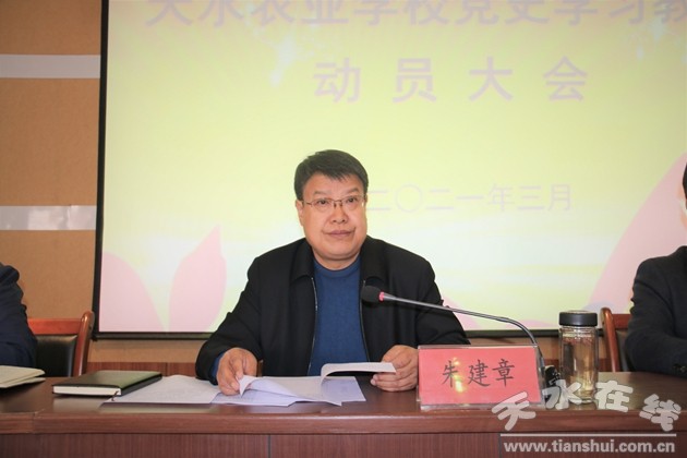 黨委書(shū)記文建水同志做了動(dòng)員講話。他指出,開(kāi)展黨史學(xué)習(xí)教育,是黨的政治生活中的一件大事,是牢記初心使命、推進(jìn)中華民族偉大復(fù)興歷史偉業(yè)的必然要求;是堅(jiān)定信仰信念、在新時(shí)代堅(jiān)持和發(fā)展中國(guó)特色社會(huì)主義的必然要求;是推進(jìn)黨的自我革命、永葆黨的生機(jī)活力的必然要求,具有重大而深遠(yuǎn)的意義。文建水同志要求:一要聚焦“學(xué)黨史”,傳承紅色基因。二要聚焦“悟思想”,強(qiáng)化理論武裝。三要聚焦“辦實(shí)事”,踐行初心使命。四要聚焦“開(kāi)新局”,扛牢時(shí)代重任。全體黨員和教職工要樹(shù)立強(qiáng)烈的進(jìn)入新階段、踏上新征程意識(shí),不斷強(qiáng)化“敢為人先、勇創(chuàng)一流”的發(fā)展意識(shí),奮力走好天水農(nóng)校逆勢(shì)崛起的高質(zhì)量發(fā)展之路。