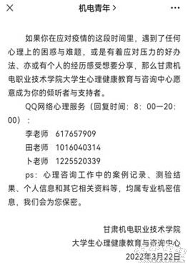 各二級學(xué)院利用微信公眾號、微博等平臺推送“心理戰(zhàn)疫小課堂”“心理賦能”等心理防疫知識,開展心理援助服務(wù)。