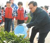 介紹完情況后,植樹活動正式開始,省委書記陸浩、蘭州軍區(qū)司令員李乾元、省長徐守盛等領導,在520#規(guī)劃路與世紀大道交匯處開始植樹,在輕聲談笑中,揮鍬、添土、澆水,細心地拍平土塊,把樹坑填平整,共同植下了一株法國梧桐。之后,幾名領導各自展開了植樹活動,每栽完一棵樹,領導們都在樹根處用土圍個圓圈,用鐵鍬拍實,并與長風小學的小同學們一起為樹木澆水。栽植了幾棵高大耐旱的落葉喬木法國梧桐后,陸浩書記又在路邊種植了3棵冬青,并細心地為一棵棵小樹澆了水。
