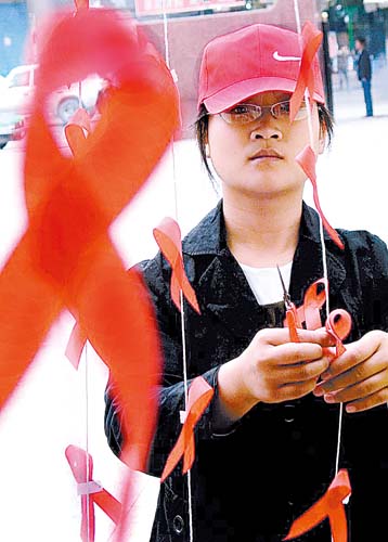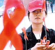 蘭州大學志愿者制作紅絲帶 宣傳防治艾滋病知識