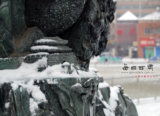 蘭州市東方紅廣場的石雕沐浴在雪中。