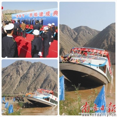 解說(shuō):“酒鋼號(hào)”現(xiàn)在還停放在黃河岸邊,但船身多處受損,幾天前這艘造價(jià)1700萬(wàn)的豪華游輪在試水典禮上,剛一下水就沉了。
