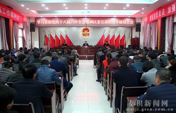 12月20日,麥積區(qū)委書記張智明深入花牛鎮(zhèn)宣講黨的十八屆六中全會(huì)精神。他強(qiáng)調(diào),學(xué)習(xí)宣傳貫徹六中全會(huì)精神,是當(dāng)前和今后一個(gè)時(shí)期全區(qū)上下的首要政治任務(wù),全鎮(zhèn)上下要按照中央和省、市、區(qū)委的部署要求,精心組織、扎實(shí)推進(jìn),以全會(huì)精神統(tǒng)一思想行動(dòng),推動(dòng)全鎮(zhèn)經(jīng)濟(jì)社會(huì)發(fā)展再上新臺(tái)階,以優(yōu)異成績(jī)迎接黨的十九大勝利召開。