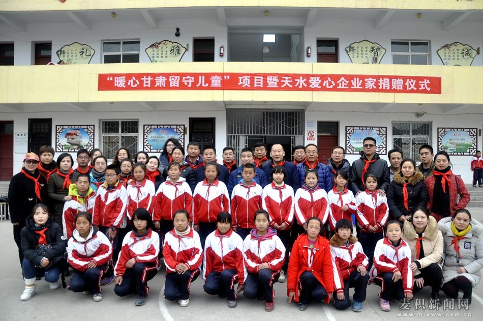 12月8日,在麥積區(qū)花牛鎮(zhèn)白家河學校,來自深圳市陽光心理健康基金會和天水市的愛心企業(yè)家在這里聯合舉行了“暖心甘肅留守兒童項目暨天水愛心企業(yè)家捐贈儀式”,該校27名貧困學生得到了社會各界的愛心資助,130多名學生受到了愛心捐贈。在寒冷的冬天里,這所小小的鄉(xiāng)村學校到處洋溢著愛的溫暖。