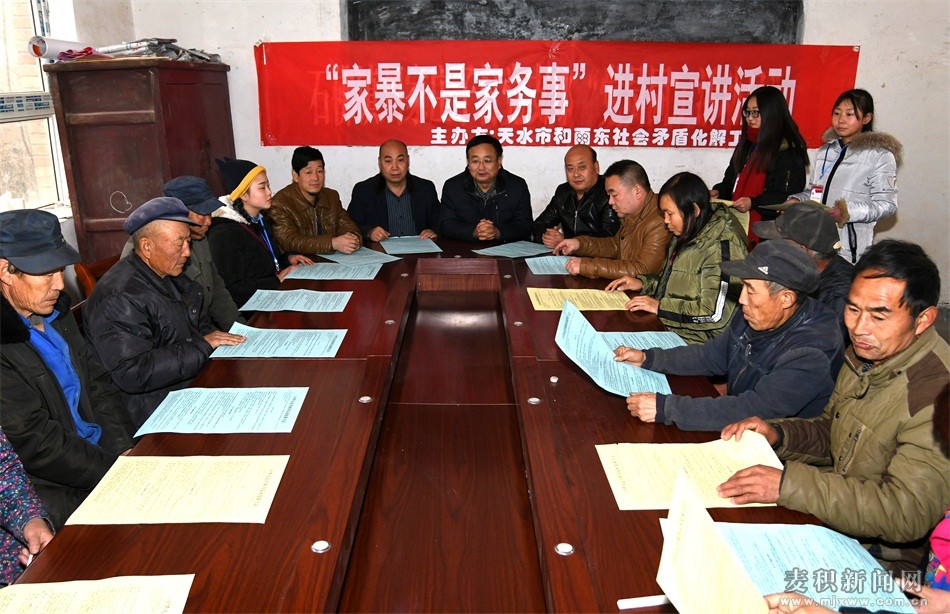 12月17日,由麥積區(qū)婦聯(lián)、天水市和雨?yáng)|社會(huì)矛盾化解工作室主辦的“家暴不是家務(wù)事”進(jìn)村宣講活動(dòng)走進(jìn)麥積區(qū)石佛鎮(zhèn)劉家莊子村,標(biāo)志著該區(qū)“家暴不是家務(wù)事”進(jìn)村、進(jìn)社區(qū)宣講活動(dòng)正式啟動(dòng)。
