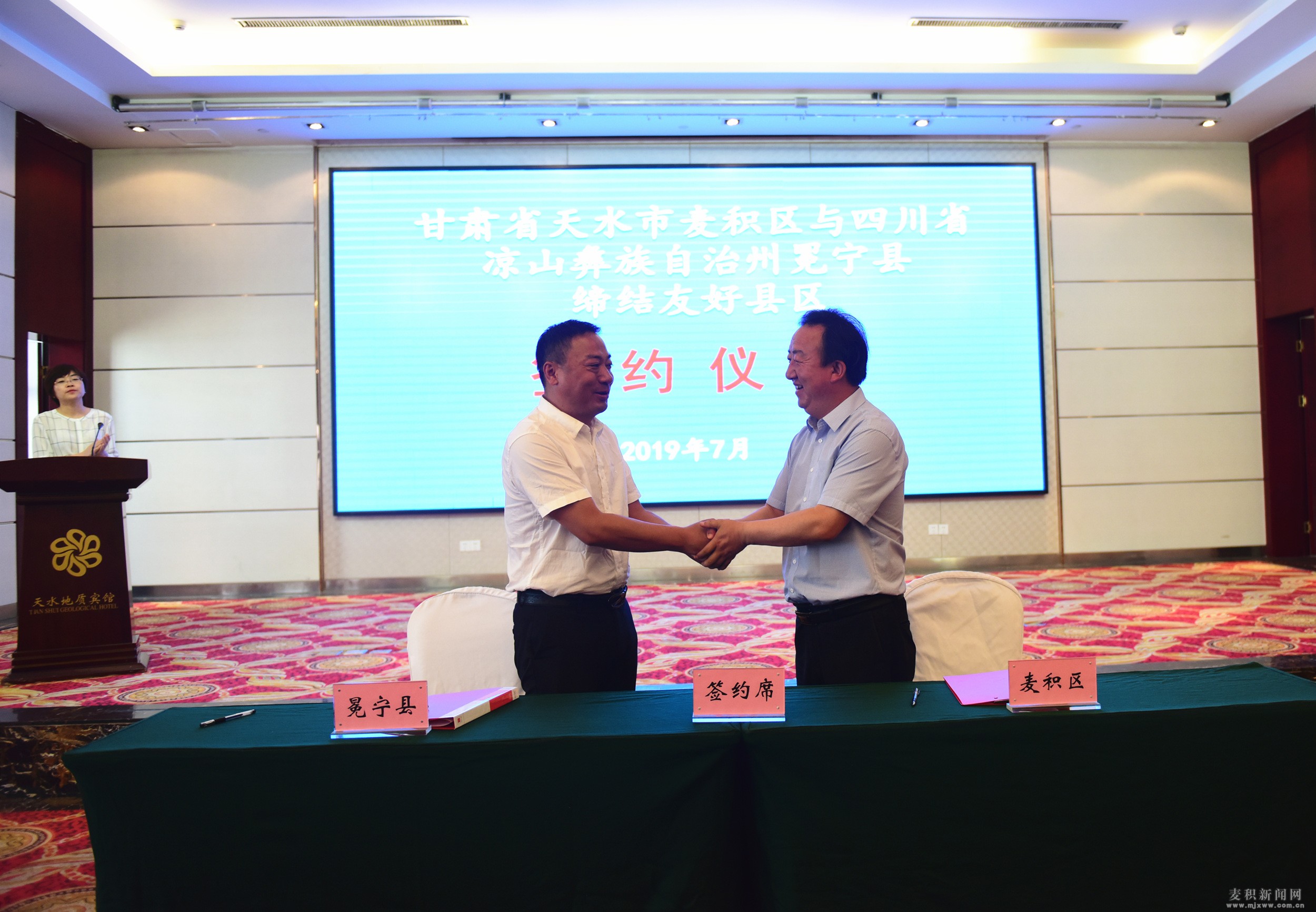 麥積區(qū)融媒體中心訊(記者 何換寶 葉順敏)7月7日上午,麥積區(qū)與四川省涼山彝族自治州冕寧縣舉行簽約儀式,締結(jié)友好區(qū)縣。麥積區(qū)政協(xié)主席高志強、區(qū)委副書記霍定明、副區(qū)長趙國平出席簽約儀式。冕寧縣委常委、統(tǒng)戰(zhàn)部部長趙東與麥積區(qū)委常委、常務(wù)副區(qū)長樊華分別代表兩地簽訂《天水市麥積區(qū)與涼山州冕寧縣締結(jié)友好縣區(qū)協(xié)議書》。麥積區(qū)委常委、統(tǒng)戰(zhàn)部部長汪亞偉主持簽約儀式。