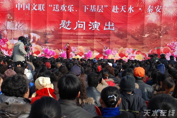 天水是羲皇故里,素稱“隴上江南”,歷史悠久、文化燦爛、生態(tài)優(yōu)美。這次來(lái)到天水,我們高興地看到,經(jīng)過30年的改革開放,天水市經(jīng)濟(jì)持續(xù)穩(wěn)定快速發(fā)展,各項(xiàng)社會(huì)事業(yè)不斷進(jìn)步,人民生活水平明顯提高,城鄉(xiāng)面貌發(fā)生了根本性變化。這里火熱沸騰的生活和日新月異的發(fā)展,常常吸引著廣大群眾文藝工作者。藝術(shù)家們來(lái)到這里,與人民群眾歡聚一堂,為人民放歌、為人民抒情、為人民祝福,將更加密切與人民群眾的血肉聯(lián)系,加深與人民群眾的魚水深情,努力創(chuàng)作生產(chǎn)更多無(wú)愧于偉大時(shí)代,讓人民群眾滿意的優(yōu)秀作品,更好地滿足廣大人民群眾日益增長(zhǎng)的精神文化需求。值此元旦春節(jié)即將來(lái)臨之際,衷心祝愿天水人民新年快樂、生活美滿、闔家幸福!預(yù)祝本次慰問演出圓滿成功!
