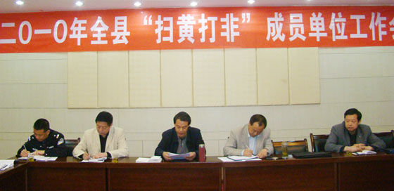 為了全面貫徹落實省、市“掃黃打非”工作會議精神,做好2010年全縣的“掃黃打非”工作,確保全縣意識形態(tài)安全和文化安全,4月28 日,秦安縣召開了2010年全縣“掃黃打非”成員單位工作會議。縣直有關(guān)部門、駐秦有關(guān)單位和興國鎮(zhèn)政府的負(fù)責(zé)人共30人參加會議。會議由副縣長郭雙江主持,會上,縣委常委、宣傳部長李尚平作了講話,縣文化旅游局局長、縣“掃黃打非”工作領(lǐng)導(dǎo)小組辦公室主任馬明祥宣讀了《天水市2010年“掃黃打非”行動方案》。