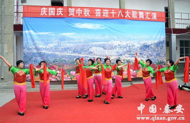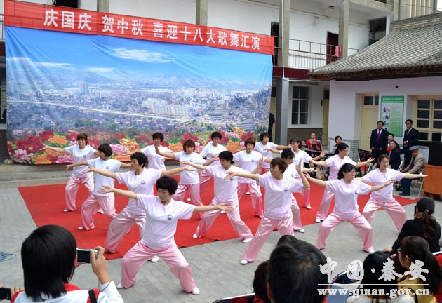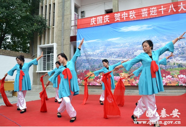 其中,10月1日上午,由秦安大眾藝術(shù)團組織演出的“慶祝國慶 歡度中秋 迎接黨的十八大”歌舞演出將本次系列展演活動推向了高潮。演出的歌舞節(jié)目有:《沒有共產(chǎn)黨就沒有新中國》、《祖國,慈祥的母親》、《和諧中國》、《南泥灣》、《洪湖赤衛(wèi)隊》等,形式包括:獨唱、大合唱、眉戶戲、太極拳表演等。整場演出貫穿了“五自”,即自導(dǎo)自演、自配樂器、自我化妝、自籌道具、自備服裝。大眾藝術(shù)團精湛的表演,博得了在場觀眾的陣陣掌聲。最后,演出在歌伴舞《今天是你的生日——我的中國》中圓滿結(jié)束。