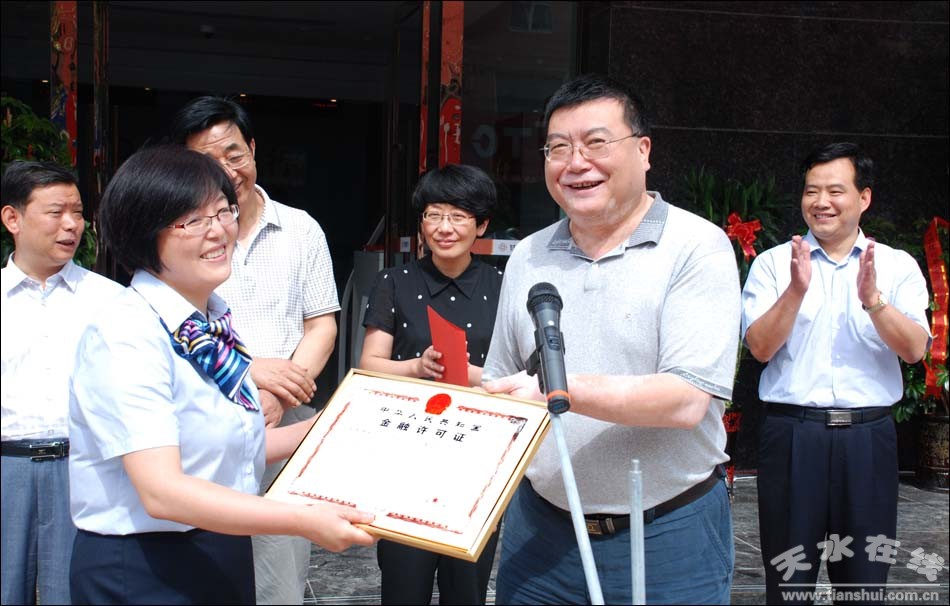(甘肅銀監(jiān)局天水分局局長王宏向甘肅銀行秦安支行頒發(fā)金融許可證)