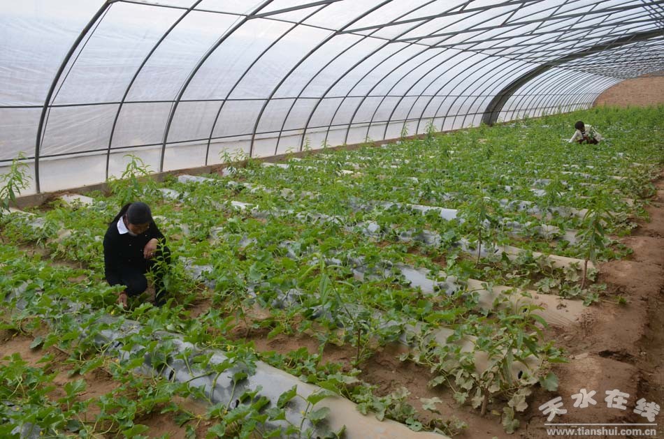 4月7日,秦安縣五營鄉(xiāng)雒塬村的村民正在日光溫室大棚內(nèi)為瓜苗打杈。
