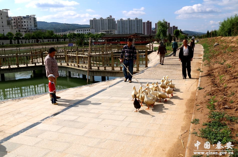 近年來,秦安縣大力實施葫蘆河城區(qū)段生態(tài)治理工程,目前一、二期工程已經完工,建成了3個文化廣場、2個健身休閑廣場、3個籃球場、3個羽毛球場和1個網球場;建成了6個人工水域和2條3公里長的園路;共栽植喬、灌、花各類景觀苗木30多種、20余萬株。正在實施的三期工程,以大片水體營造“親水近水”人文環(huán)境,與園林景觀綠化建設相互交融,建設具有現(xiàn)代園林特色的葫蘆河生態(tài)景觀區(qū)。