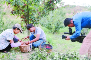 央視記者采訪正在采椒的卜濤和他的姥姥。 本報記者 王學(xué)濤 實習(xí)生 馬艷 姚明悅 攝