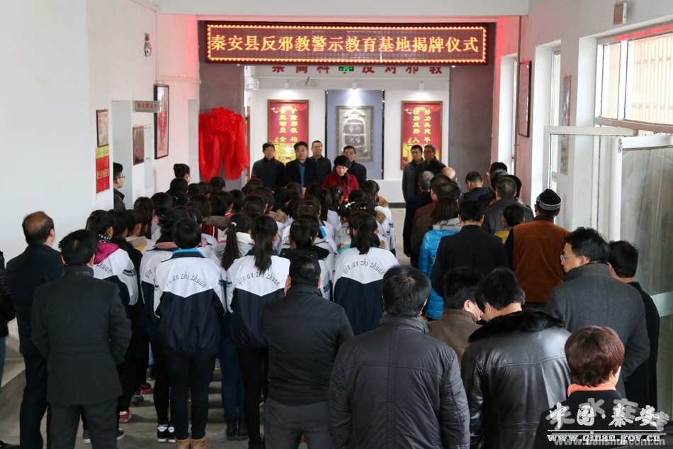 12月15日,秦安縣反邪教警示教育基地揭牌儀式在縣職業(yè)中等專業(yè)學(xué)校舉行。市委政法委常務(wù)副書記陳明達(dá),市委防范辦主任賀松峰,縣委副書記、縣長程江芬,縣委常委、政法委書記楊喜春,縣政府副縣長扇忠瑜,有關(guān)鄉(xiāng)鎮(zhèn)、各綜治維穩(wěn)反邪教成員單位領(lǐng)導(dǎo)及職校部分師生100多人參加了揭牌儀式。