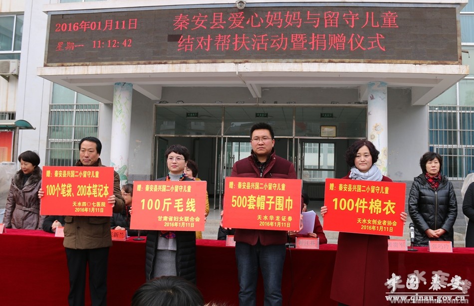 為進一步動員全社會力量,共同關(guān)注、關(guān)愛留守兒童,推動留守兒童工作的健康扎實開展,1月11日,秦安縣在興國二小舉行了“愛心媽媽”關(guān)愛留守兒童結(jié)對幫扶活動。