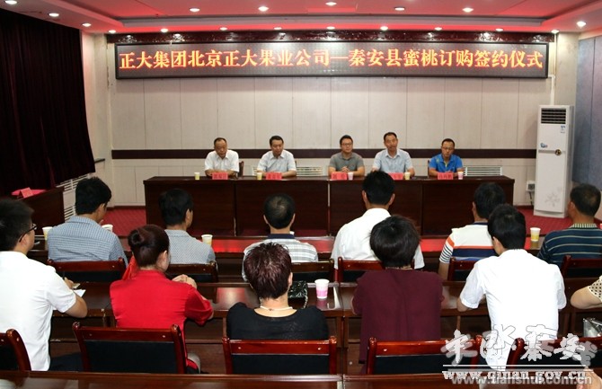 8月8日,正大集團北京正大果業(yè)公司與秦安縣蜜桃訂購簽約儀式在縣行政中心北二樓會議室舉行。正大集團北京正大果業(yè)公司副總經(jīng)理劉倫,秦安縣委副書記裴貴軍,縣委常委、縣政府副縣長郭雙江,縣政府副縣長王玉安,以及部分專業(yè)合作社、種植大戶代表參加簽約儀式。