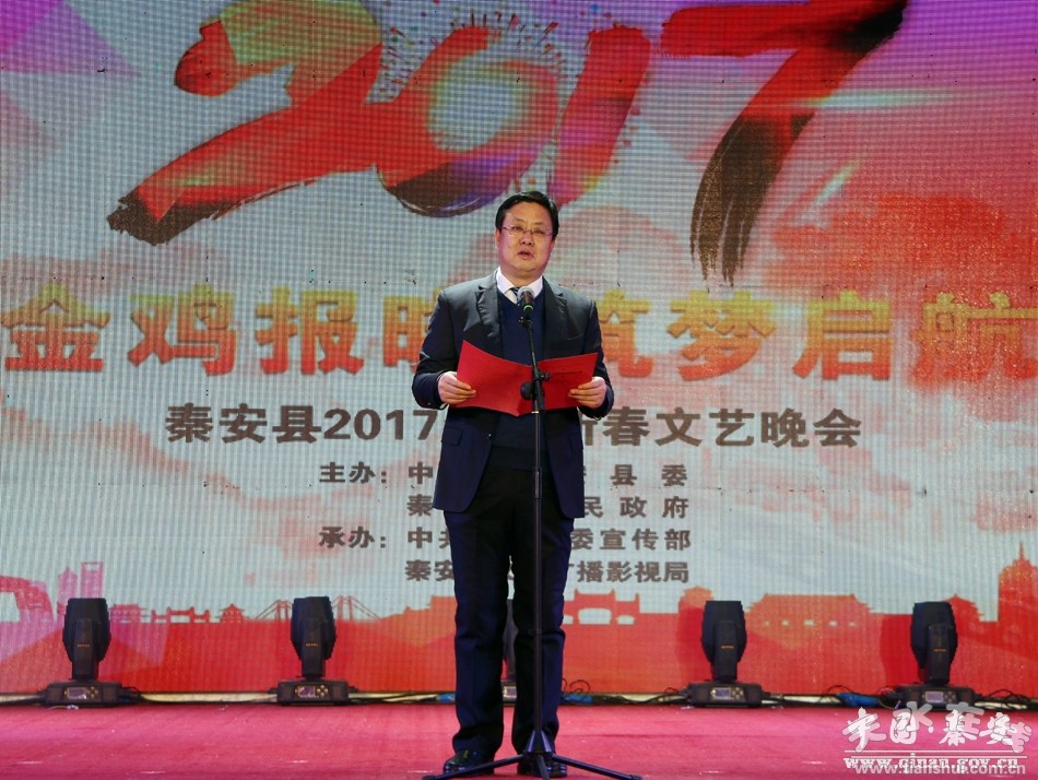 縣委書記王東紅在晚會上作了新年致辭。他說,在這喜慶美好的時刻,我謹(jǐn)代表中共秦安縣委、縣人大、縣政府、縣政協(xié),向全縣父老鄉(xiāng)親和廣大黨員干部,向駐秦武警消防官兵、離退休老干部,向所有關(guān)心支持秦安改革發(fā)展的社會各界人士、各界朋友們拜年,并致以新春的問候和美好的祝愿!