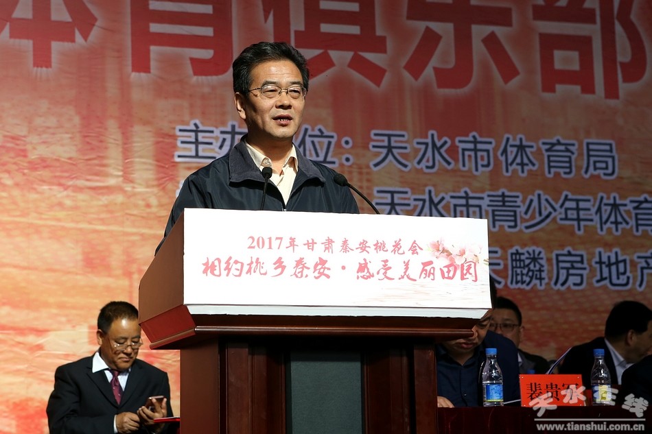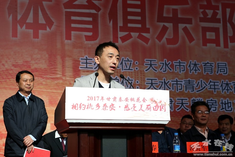 黃嘯在致辭中說,中國·秦安首屆“天麟集團·桃花杯”體育俱樂部乒乓球比賽是今年秦安縣“桃花會”各項活動中參與范圍廣、比賽水平高、宣傳作用大的一項全國性高水平的體育賽事,舉辦好本次比賽對于促進體育與文化旅游產(chǎn)業(yè)融合發(fā)展,展示秦安乃至天水改革發(fā)展新成就,提升天水對外影響力和知名度具有十分重要的意義;希望賽事組委會周密組織精心服務(wù)全力做好各項保障工作努力把比賽辦成隆重?zé)崃、和諧文明、精彩紛呈的盛會。希望廣大參賽運動員充分發(fā)揚奧林匹克精神,團結(jié)友愛、奮力拼搏,賽出風(fēng)格,賽出水平!也希望更多的社會組織和有識之士進一步關(guān)心關(guān)注我市體育事業(yè)發(fā)展,共同譜寫天水體育事業(yè)發(fā)展新篇章!