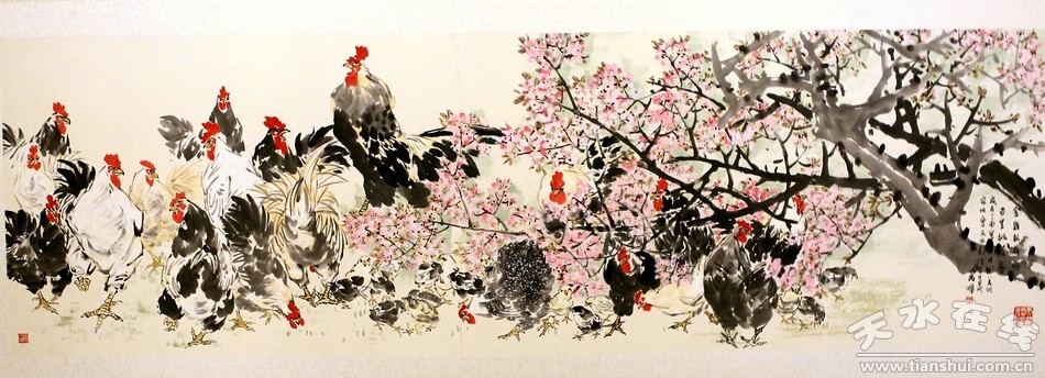 (趙萬順向秦安縣委、縣政府贈送作品《百雞鬧春桃花紅》)