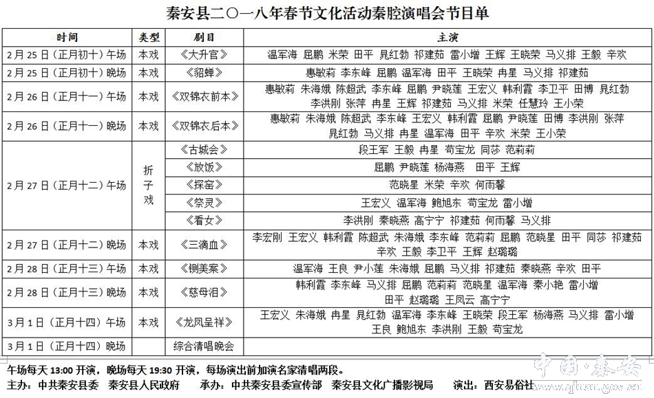 此次秦腔演唱會明星薈萃,共邀請西安易俗社惠敏莉、陳超武、李洪剛、韓利霞、王宏義、范曉星、溫軍海、朱海娥、尹小蓮、范莉莉、李東峰、屈鵬、李衛(wèi)平等眾多國家一級演員和梅花獎得主前來助陣。期間將演出《大升官》《貂蟬》《雙錦衣前本》《雙錦衣后本》《三滴血》《鍘美案》《慈母淚》《龍鳳呈祥》等精彩本戲和《古城會》《放飯》《探窯》《祭靈》《看女》等傳統(tǒng)折子戲和本子戲共13場,從2月25日(正月初十)開始至 3月1日(正月十四)結(jié)束,為期5天,將為全縣人民獻上一道豐盛的文化大餐。