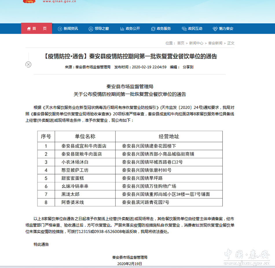 2月19日,秦安縣政府門戶網(wǎng)站發(fā)布了疫情防控期間第一批恢復營業(yè)餐飲單位的通告:對照《秦安縣餐飲服務單位恢復營業(yè)現(xiàn)場驗收審查表》20項標準嚴格審查,秦安縣成宜和牛肉拉面店等8家餐飲服務單位具備線上經(jīng)營(外賣配送)或現(xiàn)場帶走條件,準予恢復營業(yè)。標志著全縣餐飲服務行業(yè)復工營業(yè)工作有序推進。