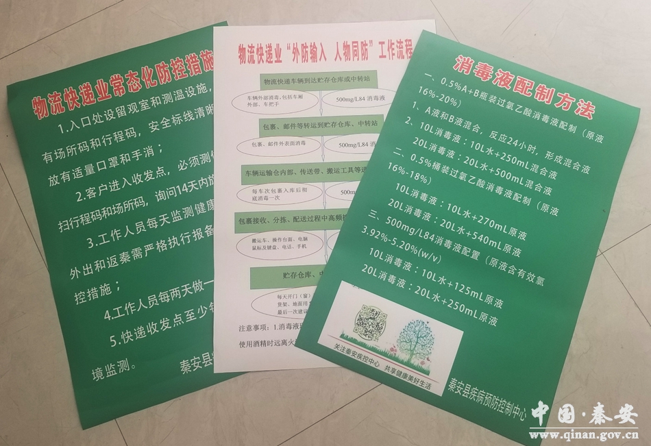 引導全縣快遞網(wǎng)點認真落實疫情防控常態(tài)化工作細則。秦安縣疾控中心根據(jù)全縣快遞行業(yè)特點,為各快遞點制作下發(fā)了《物流快遞業(yè)“外防輸入 人物同防”工作流程》《物流快遞業(yè)常態(tài)化防控措施》《消毒液配制方法》等疫情防控資料,同時派出專業(yè)技術人員對全縣各快遞網(wǎng)點進行技術督導,在制度資料上墻的同時,要求各快遞網(wǎng)點堅持“凡進必管、凡進必消”“先消毒、后分派”,堅持“人、物、環(huán)境”同防,嚴格落實郵件快件投遞前靜置管理、六面消殺規(guī)定,堅決克服麻痹思想、厭戰(zhàn)情緒、僥幸心理。