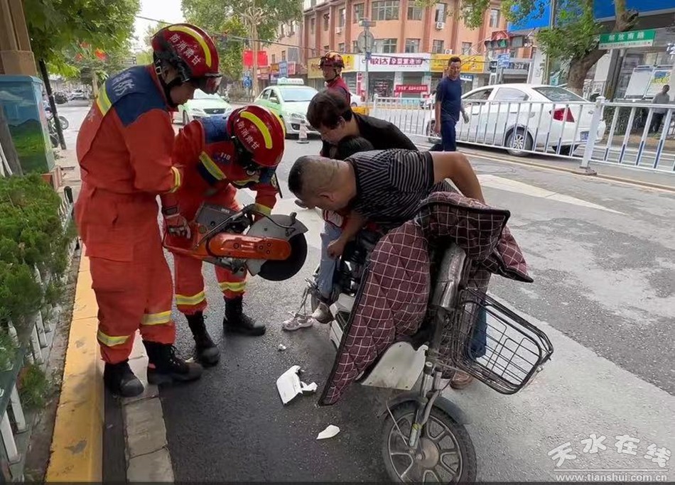 9月9日上午10時(shí)左右,秦安縣興國(guó)鎮(zhèn)解放路統(tǒng)辦大樓附近發(fā)生一起小孩腳卡電動(dòng)車(chē)事件。附近群眾第一時(shí)間撥通119報(bào)警電話求助,秦安縣消防救援大隊(duì)接警后立即派出警力趕赴現(xiàn)場(chǎng)救援。