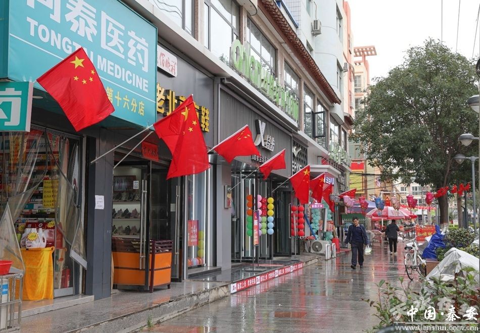 在城區(qū)各交通干道、商業(yè)街、公園廣場(chǎng)、學(xué)校等地方全部懸掛起鮮艷的五星紅旗。一抹抹絢麗的“中國(guó)紅”,成為廣大市民對(duì)祖國(guó)母親表達(dá)深厚情感和祝福的最有效、最直接方式。