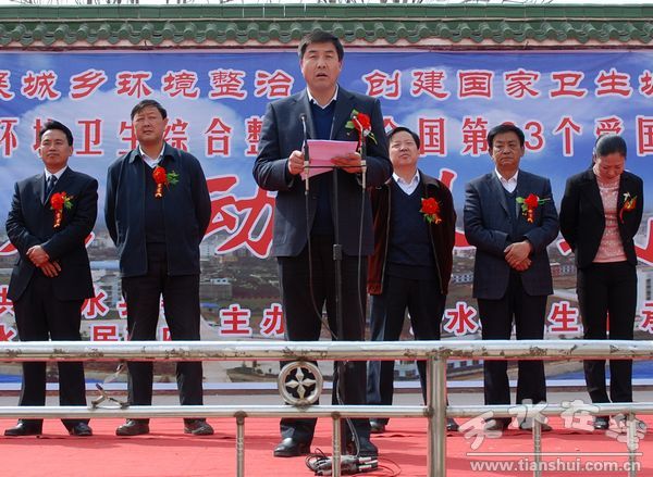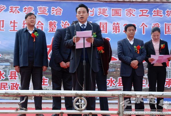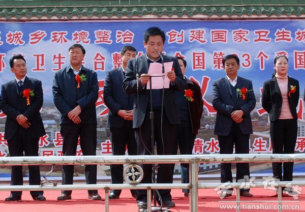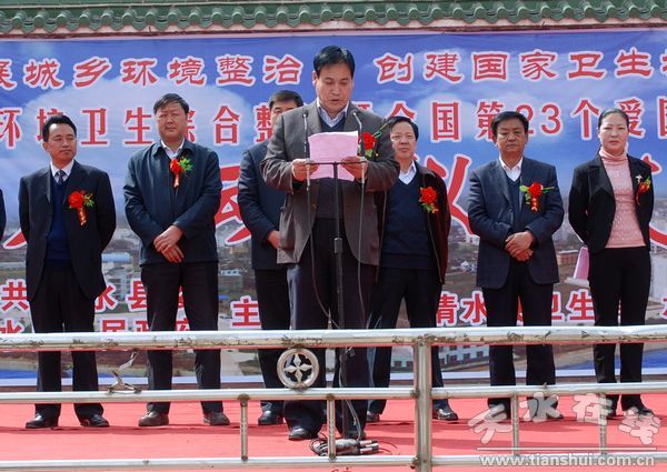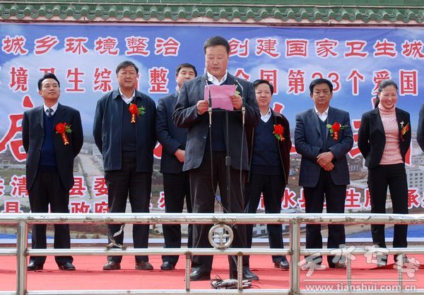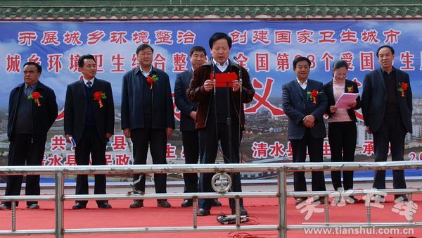 啟動儀式上,縣人大主任阮珠有宣布全縣城鄉(xiāng)環(huán)境衛(wèi)生綜合整治暨全國第23個愛國衛(wèi)生月活動啟動儀式開始;縣委副書記、縣長劉天波作了重要講話;縣委常委、副縣長馬小龍宣讀了縣委辦、政府辦《關(guān)于印發(fā)清水縣城鄉(xiāng)環(huán)境衛(wèi)生綜合整治工作實施方案的通知》;縣衛(wèi)生局、永清鎮(zhèn)、住建局、綜合執(zhí)法局負(fù)責(zé)人作了表態(tài)發(fā)言。