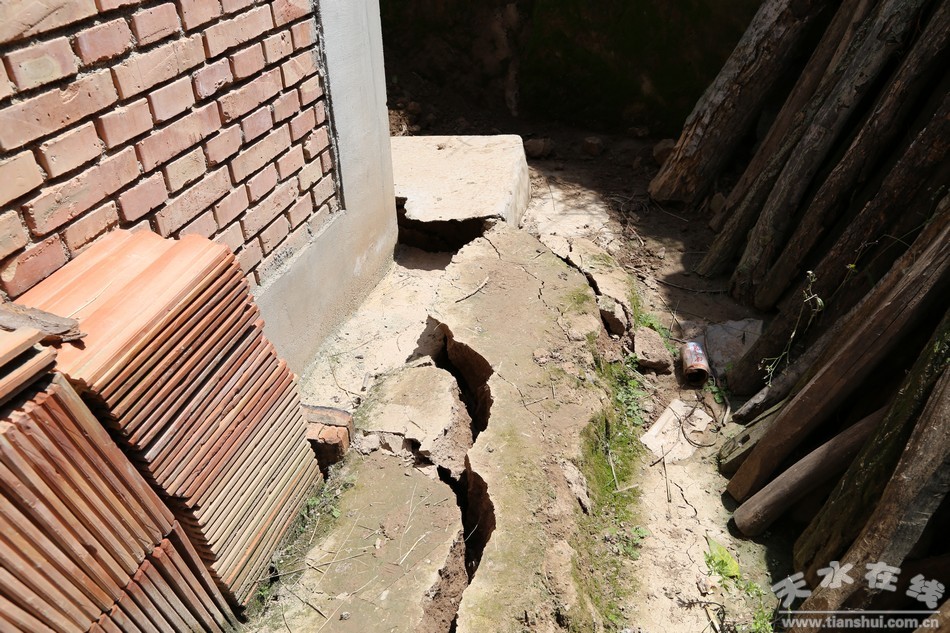 (夜明村曹王自然村所在的山體嚴(yán)重滑坡,村民住房嚴(yán)重?fù)p毀,房屋地面出現(xiàn)大裂縫)