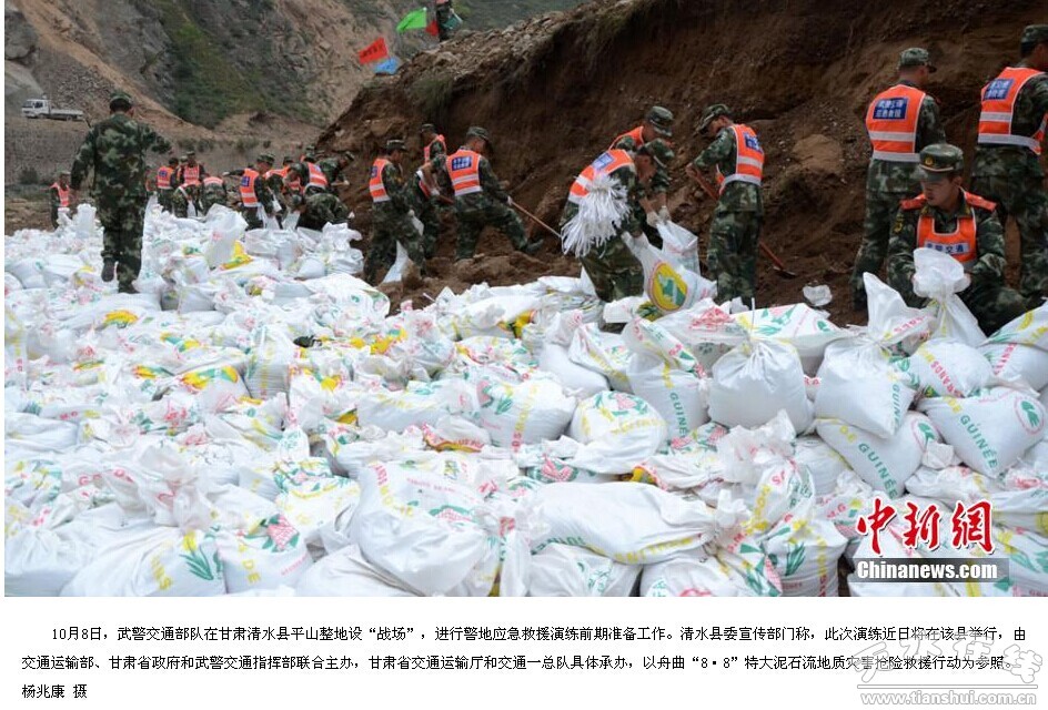 10月8日,武警交通部隊在甘肅清水縣平山整地設(shè)“戰(zhàn)場”,進(jìn)行警地應(yīng)急救援演練前期準(zhǔn)備工作。清水縣委宣傳部門稱,此次演練近日將在該縣舉行,由交通運輸部、甘肅省政府和武警交通指揮部聯(lián)合主辦,甘肅省交通運輸廳和交通一總隊具體承辦,以舟曲“8·8”特大泥石流地質(zhì)災(zāi)害搶險救援行動為參照。楊兆康 攝