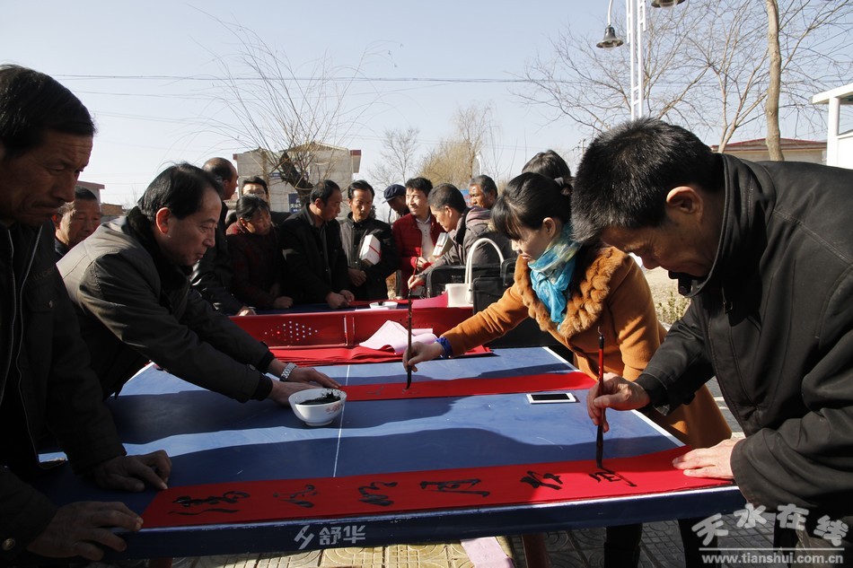 在雙聯(lián)點白沙鎮(zhèn)程溝村委會,王振宇和村干部群眾座談了解了全村經(jīng)濟發(fā)展,主導產(chǎn)業(yè)培育、勞務輸轉、村容村貌建設、群眾生活安排、基層組織建設等方面情況。隨后,組織農民群眾在程溝村文化廣場開展了贈書活動,由天水市詩詞學會會員現(xiàn)場創(chuàng)作,朗誦新時代、向往新生活的詩詞。同時,由天水市楹聯(lián)學會會員書寫春聯(lián),送去了新春的祝福。