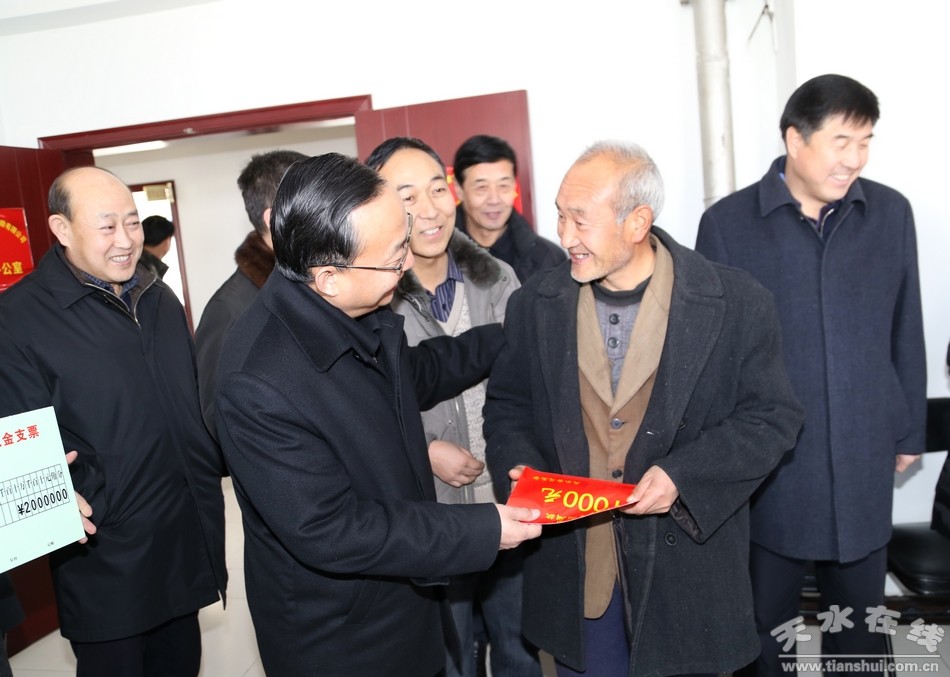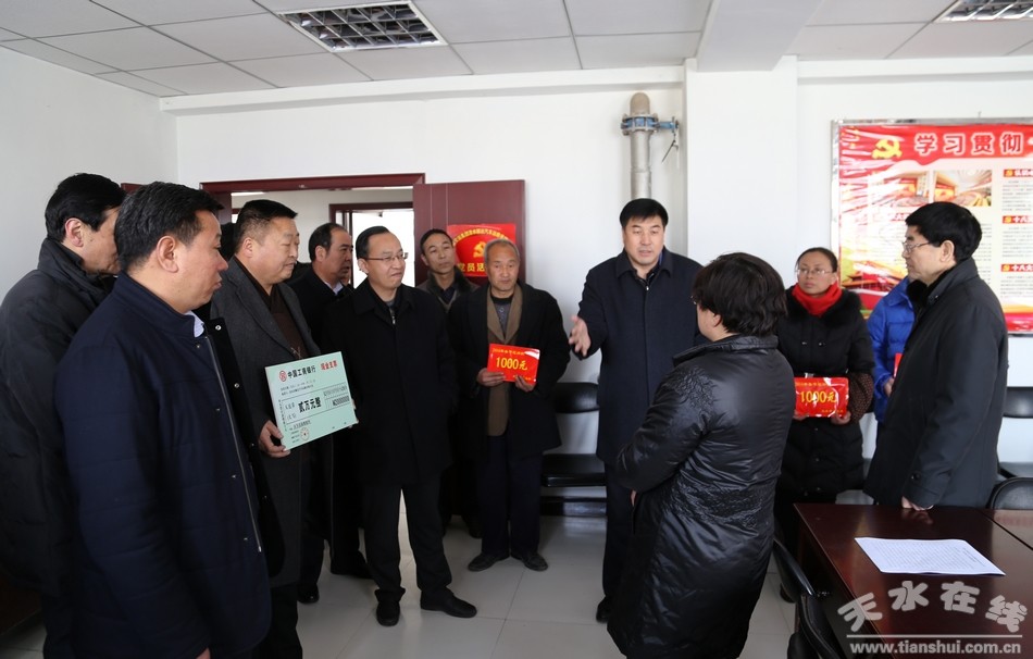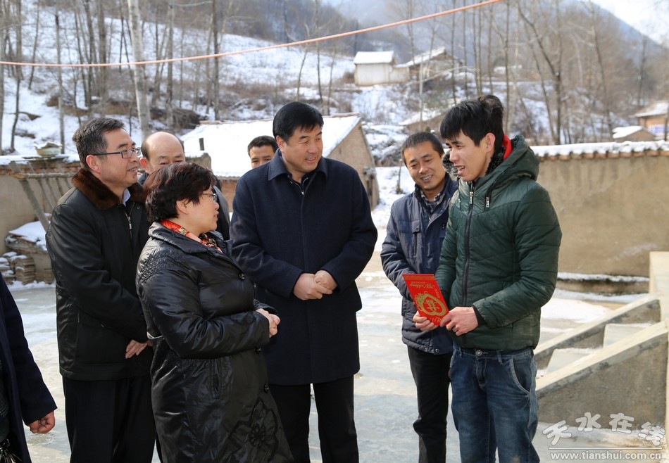 1月31日上午,春節(jié)即將來臨之際,天水市委常委、紀委書記李美華,市人大常委會副主任劉來生,市政協(xié)副主席王振宇帶領(lǐng)市委組織部、市民政局、市衛(wèi)計委、市殘聯(lián)、市總工會等部門負責人深入清水縣開展“送溫暖”慰問活動。清水縣委書記劉天波,縣委副書記、縣長馬越垠,縣委常委、紀委書記馬利民,縣委常委、政法委書記王馬代,副縣長楊泉陪同慰問。